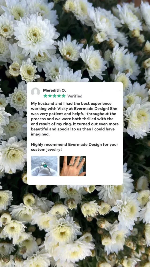 “Vicky was so knowledgeable and patient. She worked with our budget as we’re both right out of college and have limited funds, and was helpful along every step of the way. My fiancé also wanted a band to wear, so I got her to design his as well and he loves it. Can’t recommend EVERMADE enough!!”